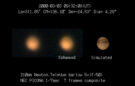 2000/03/03 09:32:08(UT) Ls=311.85 CM=136.10 De=-24.53 Dia= 4.29" 310mm Newtonian(F5) TeleVue barlow 5x(f/50) 3 deg. prism NEC PICONA 1/7sec,7 frames composite (強調画像:作成伊賀)