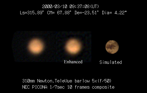 2000/03/10 09:37:08(UT) Ls=315.89 CM= 67.88 De=-23.51 Dia= 4.22" 310mm Newtonian(F5) TeleVue barlow 5x(f/50) 3 deg. prism NEC PICONA 1/7sec,10 frames composite (強調画像:作成伊賀)