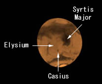 19日の画像と違ってSYRTIS MAJOR(シルチス)が見えるようになっています。かなり短期間で雲の変化が起こっているようです。ずいぶんほっそりとしたSYRTISになっていますが,南北に伸びた雲か砂嵐が一部を隠しているものと思われます。
