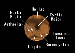 HELLASの雲は相変わらず青い色をしていますが,根市さんの画像は南極地方のリムの色が赤っぽくなっているため,一見するとHELLASの北東側だけが青いような錯覚を覚えますが,実際には全体が同じ色調になっていると考えられます。 SYRTISの北側のUtopiaは例年よりも幾分濃く感じられますし,反対にBOREOSYRTISがいつもよりも淡く感じられます。そのすぐ西側にあるISMENIUS LACUS(イスメニウス)は雲の中に包まれてその姿はよくわかりません。ふだんなら見えていてもおかしくないのですが,黄色っぽいダストがあるのかもしれません。 | ||