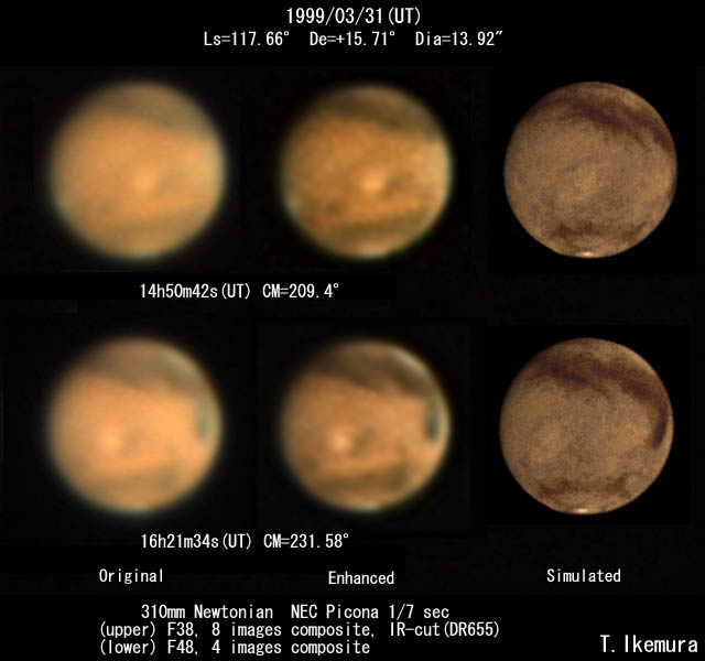 (Upper) 1999/03/31 14:50:42(UT) Ls=117.66゜CM=209.42゜De=+15.71゜Dia=13.92" 31cm F5 ニュートン テレビュー5Xバーローレンズ 1゜プリズム filter=DR655 合成 F38 NEC PICONA 1/7秒 8枚コンポジット (強調画像:作成伊賀) |