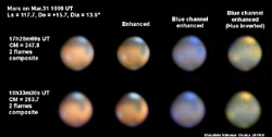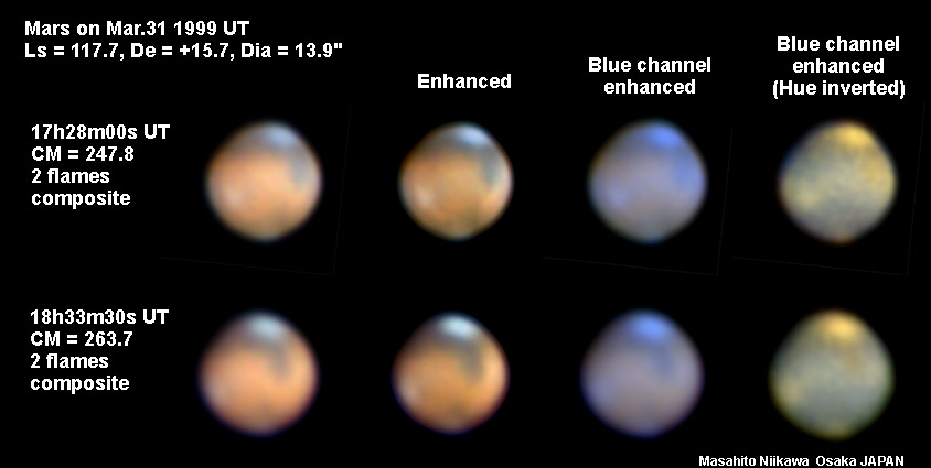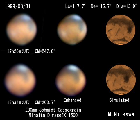 (Lower) 1999/03/31 16:21:58(UT) Ls=117.69゜CM=231.67゜De=+15.71゜Dia=13.93" 31cm F5 ニュートン テレビュー5Xバーローレンズ 1゜プリズム 合成 F48 NEC PICONA 1/7秒 4枚コンポジット (強調画像:作成伊賀) | |
