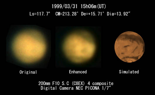 ![]() 1999/03/31 15:05:21-15:06:32(UT) Ls =116.7゚ CM=213.28゜De=+15.71゜Dia=13.92" 200mm F10 S.C(C8EX) 4 composite Digital Camera NEC Picona 1/7" 強調画像作成:伊賀 | ||