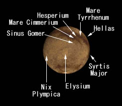 HELLAS(ヘラス)には明るい雲が見えてきていますが,やや暗めではないかという気がします。南中のときにどれくらいか見たいところでした。SYRTIS MAJOR(シルチス)の方にも淡い雲がかかっていますが,この部分は朝霧だと思われます。 南半球のMARE CIMMERIUMU(キンメリア)が見事に見えていますが,そのすぐ北東側にほんの少しはなれてSinus Gomer(ゴメル)が淡く認められます。今シーズンで最初の確認できた画像だと(池村)思います。かなり淡いのですが,まだ存在することが確認できました。また,MARE CIMMERIUMとMARE TYRRHENUM(ツィレナム)との間に,線状にあるHESPERIUM(ヘスペリウム)の北側半分が注意すると写っているのがわかります。気流がよくないと確認できにくいものですが,これについても確認できました。 | ||