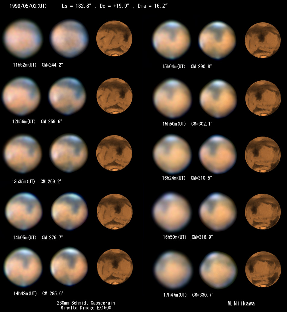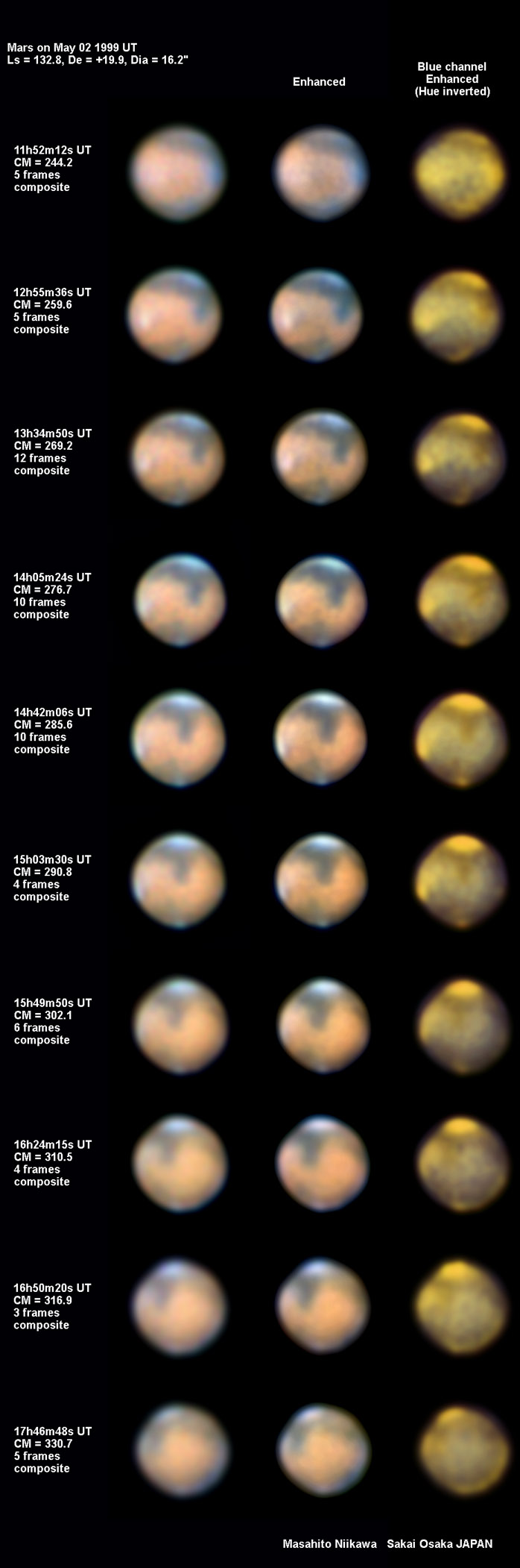 ![]() 1999/05/02 14:08:12(UT) Ls=132.83゜ CM=277.36゜ De=+19.89゜ Dia=16.18" 20cm F8ニュートン反射(苗村鏡) テレビュー3Xバーローレンズ 合成F24 NEC PICONA 1/7秒 3枚コンポジット アンシャープマスク処理 2°プリズム 透明度 8/10 シーイング 8/10 強調画像作成:伊賀 (こちらで拡大した画像としました) | |||
