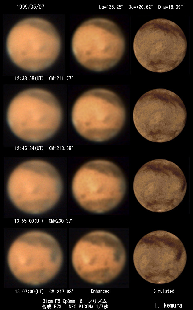 1999/05/07 13h48m(UT) Ls=135.26゜ CM=228.60゜ De=+20.62゜ Dia=16.09" 350mm Schmidt-Cassegrain BITRAN BJ-30L Cooled CCD Camera R-filter, 1/8sec, Single image | ||