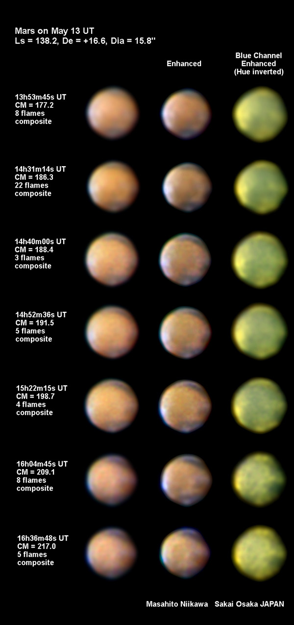 1999/05/13(UT) Ls = 138.2, De = +16.6, Dia = 15.8" 13h53m45s(UT), CM = 177.2, 8 frames composite 14h31m14s(UT), CM = 186.3, 22 frames composite 14h40m00s(UT), CM = 188.4, 3 frames composite 14h52m36s(UT), CM = 191.5, 5 frames composite 15h22m15s(UT), CM = 198.7, 4 frames composite 16h04m45s(UT), CM = 209.1, 8 frames composite 16h36m48s(UT), CM = 217.0, 5 frames composite |
