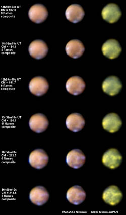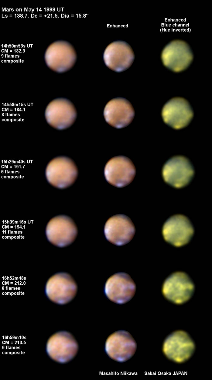 1999/05/14(UT) Ls = 138.7, De = +21.5, Dia = 15.8" 14h50m53s(UT), CM = 182.3, 9 frames composite 14h58m15s(UT), CM = 184.1, 8 frames composite 15h29m40s(UT), CM = 191.7, 6 frames composite 15h39m16s(UT), CM = 194.1,11 frames composite 16h52m48s(UT), CM = 212.0, 6 frames composite 16h59m10s(UT), CM = 213.5, 6 frames composite |