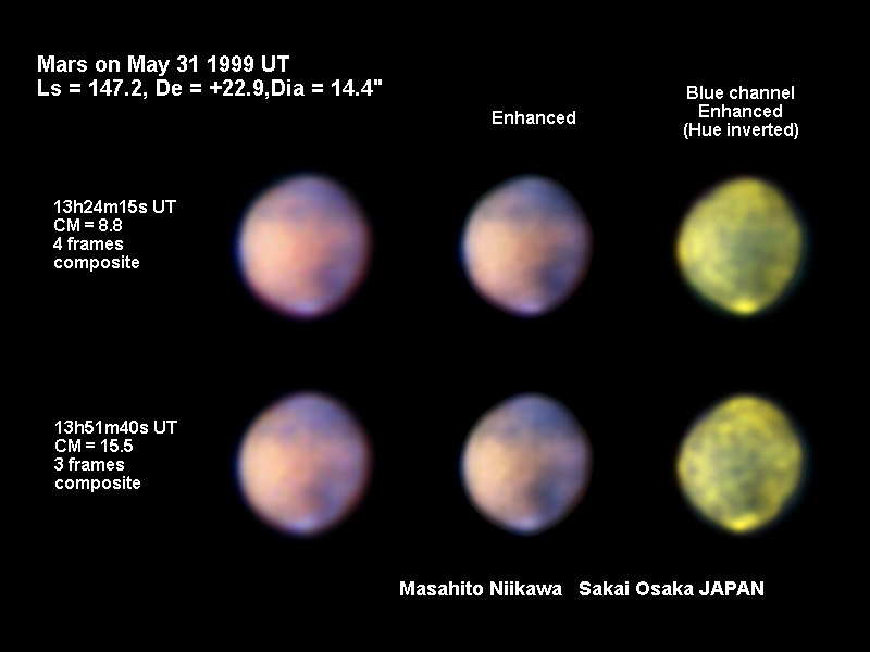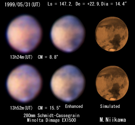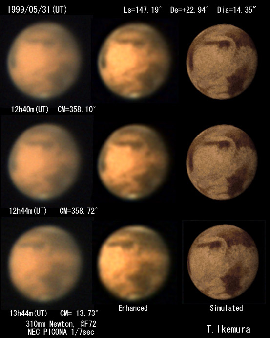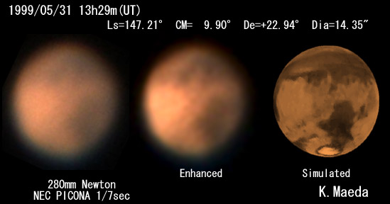 1999/05/31 13h29m(UT) Ls=147.21 CM= 9.90 De=+22.94 Dia=14.35" 280mm Newton, NEC PICONA 1/7sec | ||