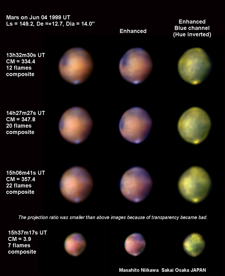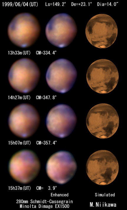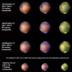 1999/06/04(UT) Ls = 149.2, De =+23.1, Dia = 14.0 13h32m30s(UT), CM = 334.4, 12 frames composite 14h27m27s(UT), CM = 347.8, 20 frames composite 15h06m41s(UT), CM = 357.4, 22 frames composite 15h37m17s(UT), CM = 3.9, 7 frames composite |