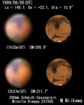1999/06/04(UT) Ls = 149.7, De = +23.1, Dia = 13.9" 11h31m50s(UT), CM = 295.9, 6 frames composite 12h36m40s(UT), CM = 311.7, 6 frames composite |