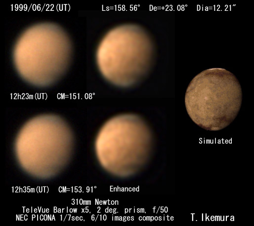 1999/06/22 12:23:06(UT) Ls=158.56 CM=151.08 6 images composite 1999/06/22 12:34:42(UT) Ls=158.57 CM=153.91 10 images composite De=+23.08 Dia=12.21" 310mm Newton(F5) TeleVue barlow 5x f/50, 2 deg. prism, NEC PICONA 1/7sec (Enhanced by Y.Iga)