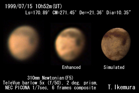 南極地方のフードは東のほうまでずいぶん広がっていることがよく分かります。特に,Eridania(エリダニア)がずいぶん明るくなっている様子が捉えられています。夕霧と一緒になって明るくなって写っているものと思われますが,全周にわたっての拡散を示唆しています。 暗色模様についてよく見ると,Syrtis(シルチス)のすぐ東に接するようにある,Moeris(モエリス)が目立って見えています。この時期になって濃くなったのか,あるいは周辺減光によるいたずらかよく分かりませんが,近年ほとんど見えなかっただけにこの写り方はいささか気になります。 | ||