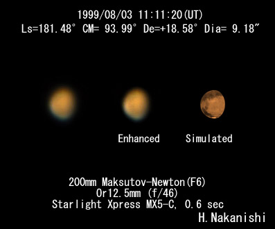 南極冠らしき見え方が一層はっきりしてきましたが,まだまだ周辺に位置しており,きれいな姿を見るにはいたりません。今回は南極地方よりも北極地方の雲のほうがよく目だっています。 今まで頻繁に雲が発生していたTempe(テンペ)の東側には目だった雲は見られませんでした。そのかわり,北極地方全域が大きくベールに覆われたように明るくなっているのが印象的でした。 模様ではGanges(ガンゲス)が全体的に見て濃くなって見えています。今までになく濃く見えており,この付近を覆っていた淡い雲が晴れたことをうかがわせています。また,Solis(ソリス)の西側に位置する,Tharusis(タルシス)3山のうちもっとも南に位置するArcti(アークティ)に明るい雲が認められるようです。 | ||