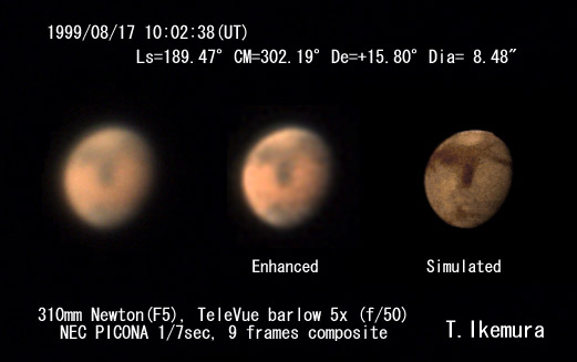目立つ現象としてはBoreo Syrtis(ボレオシルチス)のすぐ北東に丸い明るい雲が発生していることです。この雲は今回接近で目立つAcidalium周辺に発生していた雲と同じ様なものらしく,緯度的にも非常によく似通っています。 Syrtis(シルチス)の中央よりやや南側が東西に淡く切れたようになっており,また,西側の端も淡くなっていますが,これは赤道付近に淡い雲があってこれの影響で起った現象かと思われます。シルチスの西側の淡くなった部分のすぐとなりに接するようにArabia(アラビア)の一部分が明るく写っていますが,これがその一部かと思われます。 | ||
