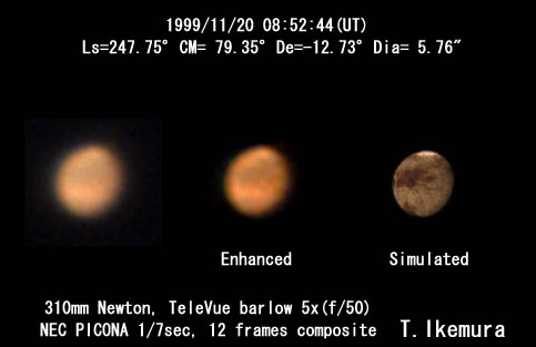 1999/11/20 08:52:44(UT) Ls=247.75 CM= 79.35 De=-12.73 Dia= 5.76" 310mm Newton(F5) TeleVue barlow 5x f/50 2 deg. prism NEC Picona 1/7sec, 12 frames composite (強調画像:作成伊賀)