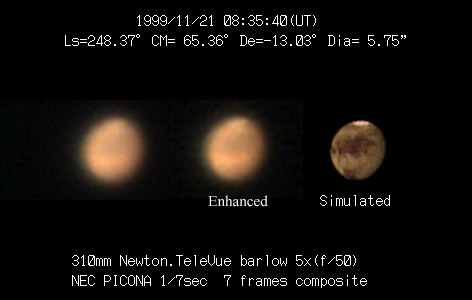1999/11/21 08:35:40(UT) Ls=248.37 CM= 65.36 De=-13.03 Dia= 5.75" 310mm Newtonian(F5) TeleVue barlow 5x f/50 3 deg. prism NEC PICONA 1/7sec,7 frames composite (強調画像:作成伊賀)