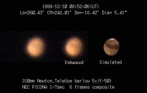 1999/12/10 08:52:06(UT) Ls=260.43 CM=242.01 De=-18.42 Dia= 5.41" 310mm Newtonian(F5) TeleVue barlow 5x f/50 2 deg. prism NEC PICONA 1/7sec,6 frames composite (強調画像:作成伊賀)