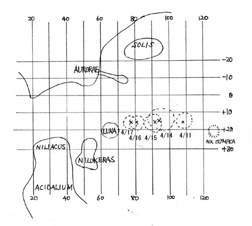 地球の大気の場合は,赤道直下では東から西に向かって流れている(台風の動きから顕著にわかる)。季節にもよるが,北半球では北緯15°近辺で転向点を迎え,そこから急にコリオリの力の影響を受け,反対方向に転じ,極の方向へ北東の方向に向かって進路を取るのが普通の様子である。 火星の大気は,火星本体の直径が小さいこともあり,大気の流れは極地方から極地方への大循環になっているといわれている。事実,北極冠の縮小と共に,火星の北半球の暗い模様が濃化することから,この様な流れが眼視的にも観測されている。したがって,火星の場合は上に述べたような大気の循環を考えることができない。 1973年に火星の全面を覆った,大黄雲はこの地域では東進していたが,今回の雲はこの時の雲と同じように東進している。過去の観測から考えると,上に述べた大循環を考慮して,南東方向に移動するのが一般的と考えられるが,今回の移動は緯度においてはほとんど変化がなく,経度減少方向に移動しただけのように思われる。このことから,自転にともなって起こる上空の偏西風に流された可能性が強く,この雲は火星の表面の砂嵐のようなものではなく,大気の上層にできた雲だったのではないかと考えられる。 | |||||||||||||||||||||||||||||||||||||