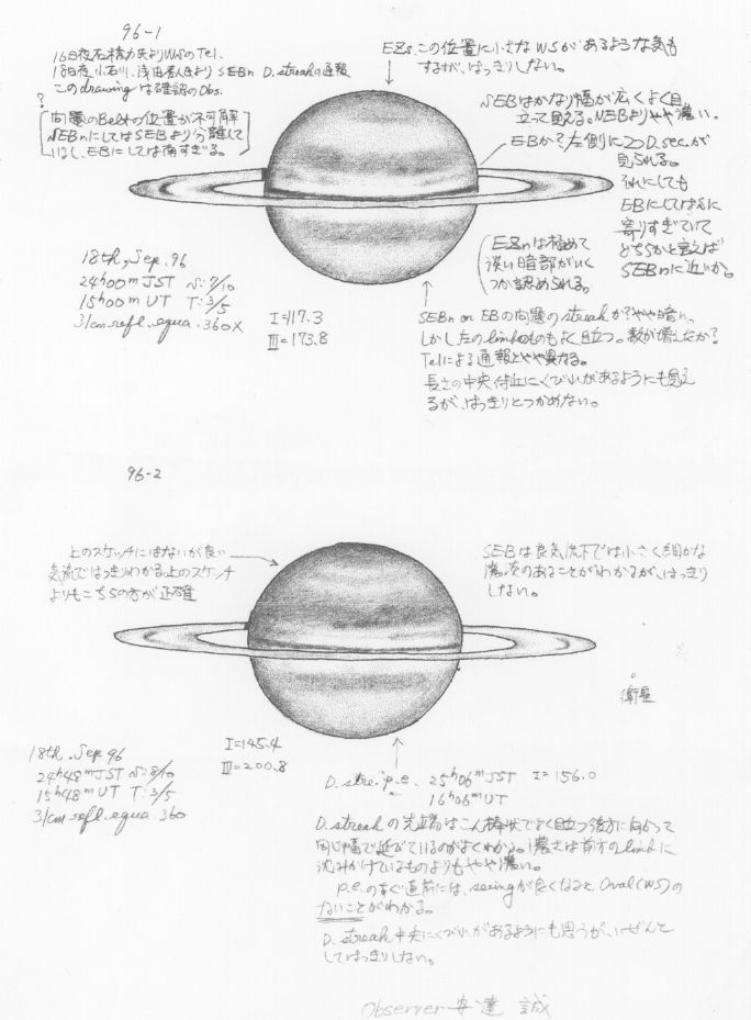 ところで、昨年までの土星はEZの南側がやや広くなっていましたから、今回の暗班の緯度はひょっとすると本来のSEBの北組織の上にできた斑点かもしれません。だれか写真とかCCDの画像を使うなどして緯度を割り出していただけないでしょうか。まだ何ともいえませんが、今後とも追跡のほど宜しくお願い申し上げます。