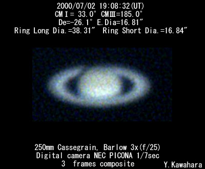 2000/06/14 19:23:30(UT) I= 33.0 III=185.0 De=-26.1 E.Dia=16.81" Ring Long Dia=38.31" Ring Short Dia=16.84" 250mm Cassegrain, Barlow 3x(f/25) NEC Picona 1/7sec, 3 frames composite