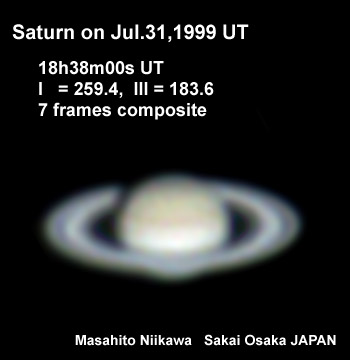 | 1999/07/31 19:00:50(UT) I=272.8 III=196.4 | 200mm Newton(F4), LV20mm (f/28) NEC PICONA 1/7sec, 3 frames composite Enhanced by Y.Iga | |