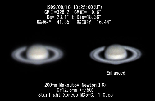 | 1999/08/18 18:22:00(UT) I=328.2 III= 9.6 De=-23.1゜E.Dia=18.36" 輪長径 41.85" 輪短径 16.44" | 200mm Maksutov-Newton(F6), Or12.5mm (f/50) Stalight Xpress MX5-C, 1.0sec Enhanced by H.Nakanishi | |