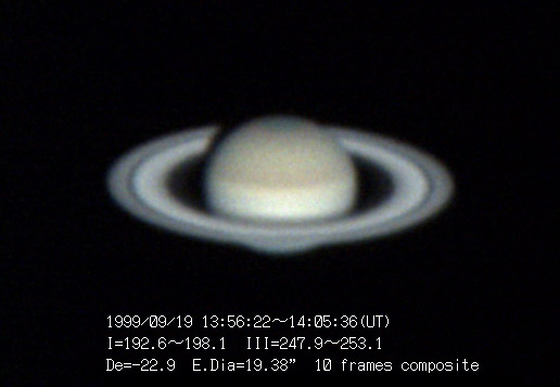 1999/09/09(UT) 13:56:22-14:05:36 I=192.6-198.1 III=247.9-253.1 De=-22.9 E.Dia=19.38" Ring Long dia 44.18" Ring short dia 17.21" 310mm Newtonian(F5) TeleVue barlow 5x f/35, 2 deg. prism, Digital camera NEC PICONA 1/7sec 10 frames composite