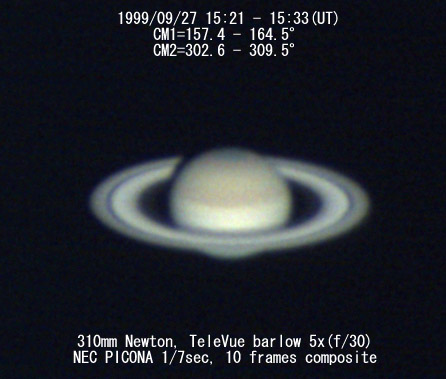 1999/09/27(UT) 15:21-15:33 I=157.4-164.5 III=302.6-309.5 De=-22.8 E.Dia=19.60" Ring Long dia 44.69" Ring short dia 17.32" 310mm Newtonian(F5) TeleVue barlow 5x f/30, 1 deg. prism, Digital camera NEC PICONA 1/7sec 10 frames composite