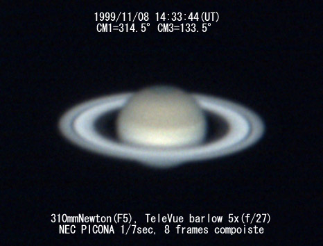 1999/11/08(UT) 14:33:44(UT) I=314.5 III=133.5, 8 frames composite De=-21.8 E.Dia=20.16" Ring Long dia 45.96" Ring short dia 17.09" 310mm Newtonian(F5) TeleVue barlow 5x f/27 Digital camera NEC PICONA 1/7sec