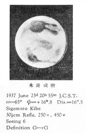 1937/06/25 11:57(UT) 1937/06/25 20:57 Φ= 65Σ=16.8 Dia= 16".4 Seeing 8-9 Definition rG