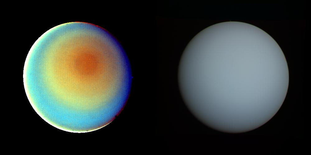 これは天王星の南極です。左側は擬似カラーにより色を強調したもので正しい色ではありません。
