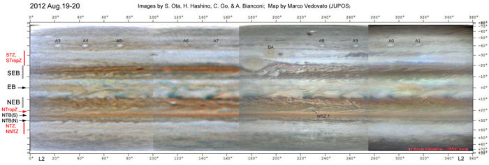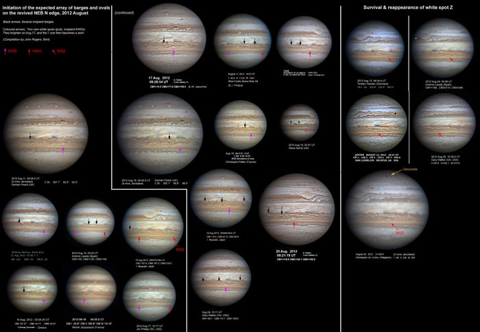 2012年、木星は隣接したドメインに起こった、NEBとNTBの復活からなる、2つ同時の大アウトブレーク(outbreak)という前代未聞の光景を示している。両方のoutbreakは太陽との合の直前に始まり、その見えない期間にほとんど発達したが、6月に木星が再び現れた時に劇的な攪乱(disturbance)は明らかであった【文献1】。現在、木星が高く昇るにつれて良くなった画像によって、またJUPOSチームからのチャートやマップによって、何が起こっているかを示す鮮明な画像を得ている。このレポートは7月と8月上旬をカバーする。執筆時点では、8月下旬で攪乱領域は落ち着いているように見える。だから、さらに結果が出るかもしれないけれども、これが現代では先例のない攪乱の主要なレポートになるだろう。