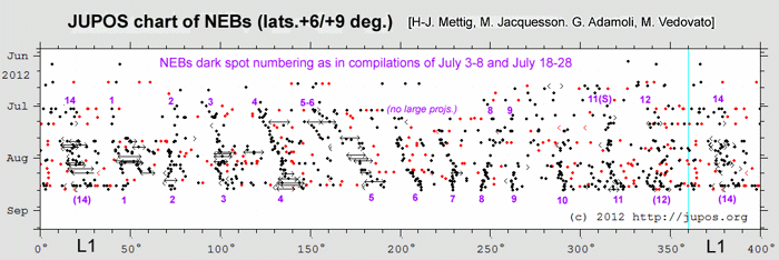 From late July onwards, the JUPOS chart for mid-NEB does show a pair of bright streaks that were moving with DL1 = +4.1 deg/day (DL2 = -3.6 deg/day) , but in a different longitude sector.