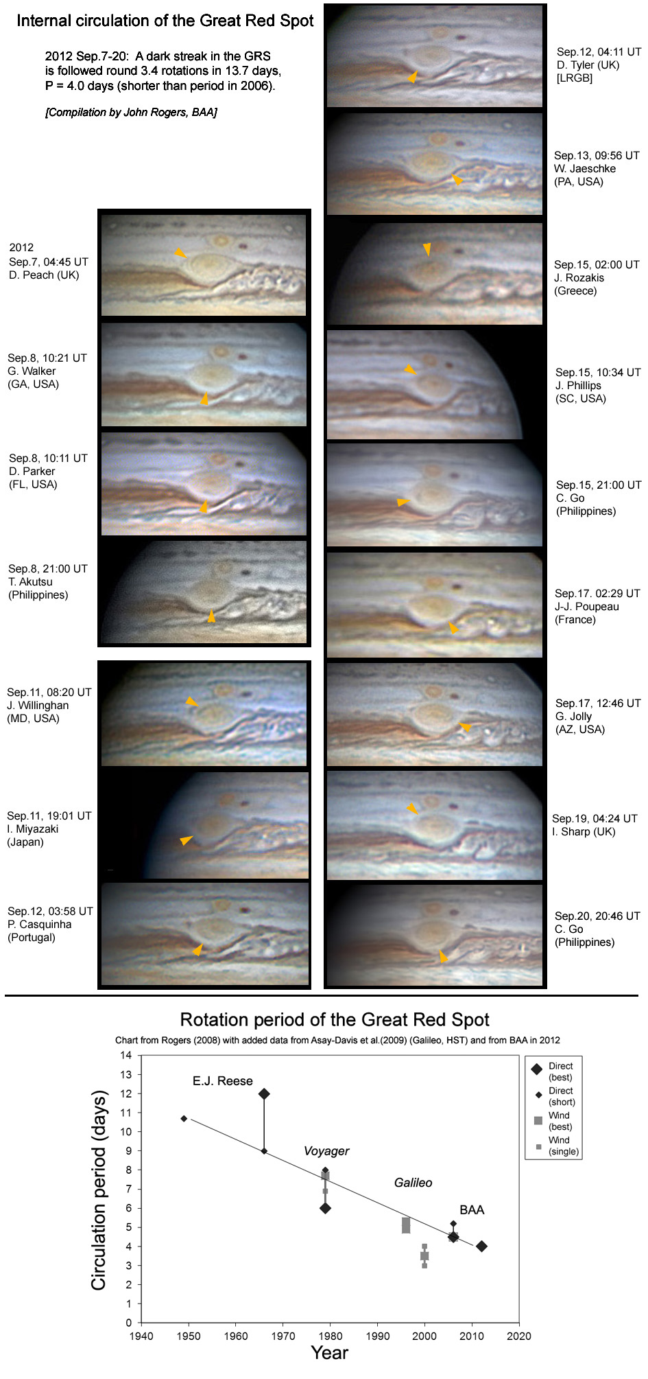 Illustration:Top: Set of images of the GRS in 2012 Sep., from the same images that were posted in report no.6. There is a dark streak circulating within the GRS, indicated by a yellow arrowhead. South is up. Bottom: Chart showing all determinations of the GRS rotation period, as in ref.1, plus data derived from ref.2, and our latest result. Diamonds represent direct measurements of the period (large points, over several rotations; smaller points, over shorter intervals); squares represent periods calculated from maximum wind speeds observed from spacecraft (large points, from best fits; smaller points, from single values). Apart from the value from Galileo on 2000 May 22 (when the wind speed seems to have been anomalously fast), there is a linear trend to shorter rotation periods.