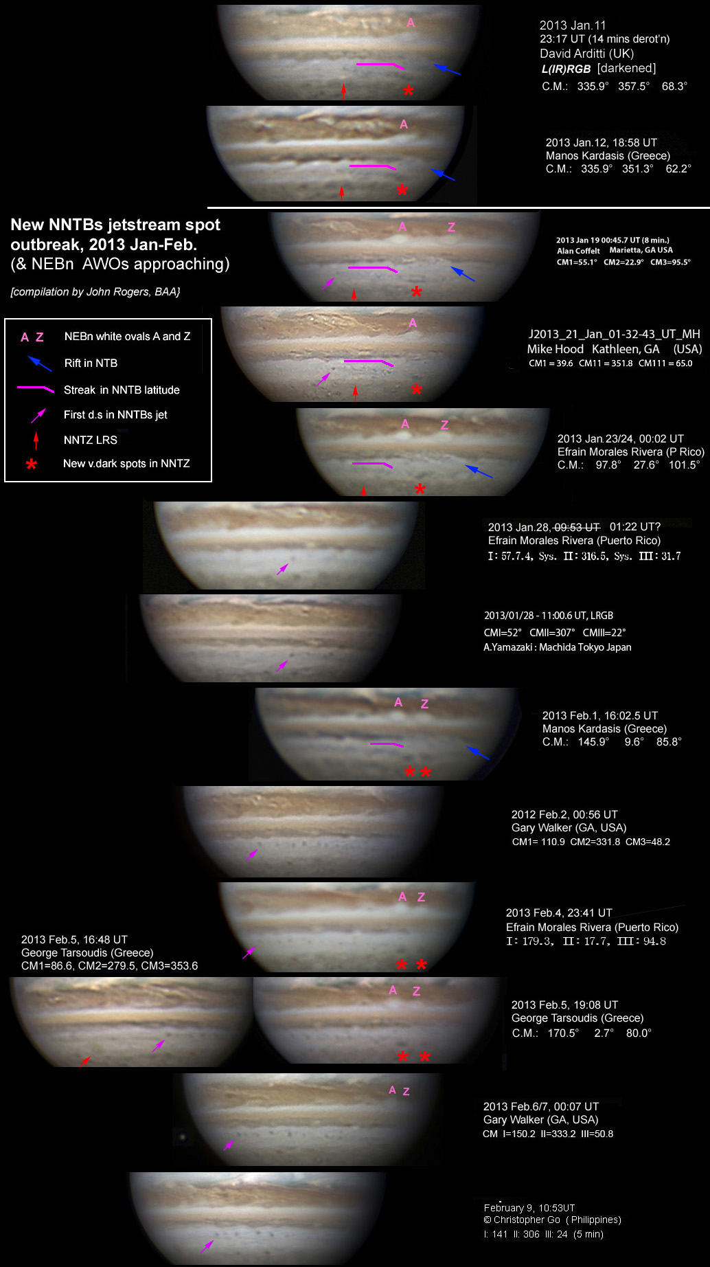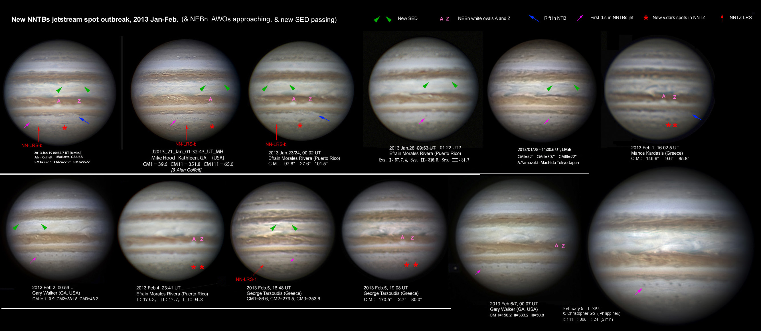 Hello all, The attached set of images shows three notable developments on Jupiter, which all deserve close attention in the next week or two. 1) NNTBs jet-stream activity resumes: Since the NTB upheaval started last April, the whole N.N.Temp. domain has been virtually white and the usual NNTBs jet-stream spots have been absent. On Feb.7, Gary Walker took a fine image on which Manos Kardasis pointed out: “NNTB dark spots have shown up. Is it a sign that will lead to a NNTB darkening?”