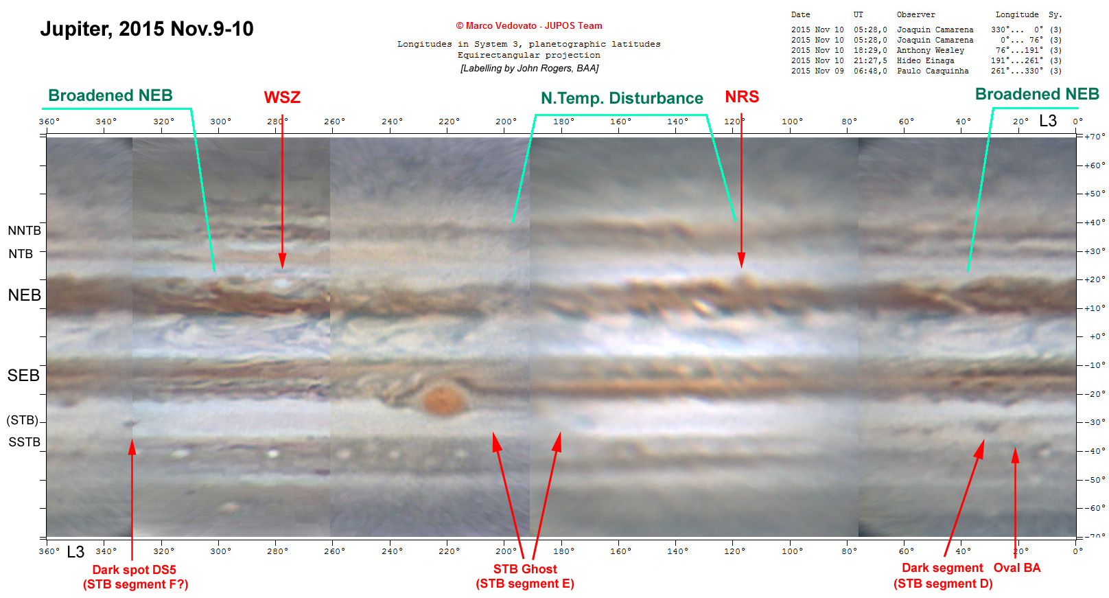 ![]() Click to original size Attached is an annotated map of the planet, with north up. In addition to the broadened sector of NEB, a darkened sector of N. Temperate Zone called a N. Temperate Disturbance is also marked. Links to larger versions of this and other illustrations, and alternative versions with south up, are posted on a separate page at: https://britastro.org/node/6810