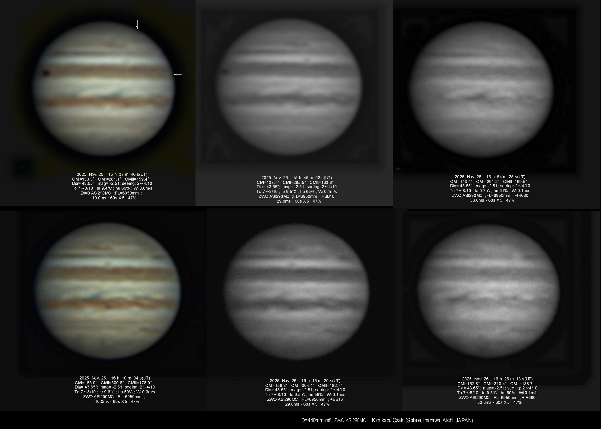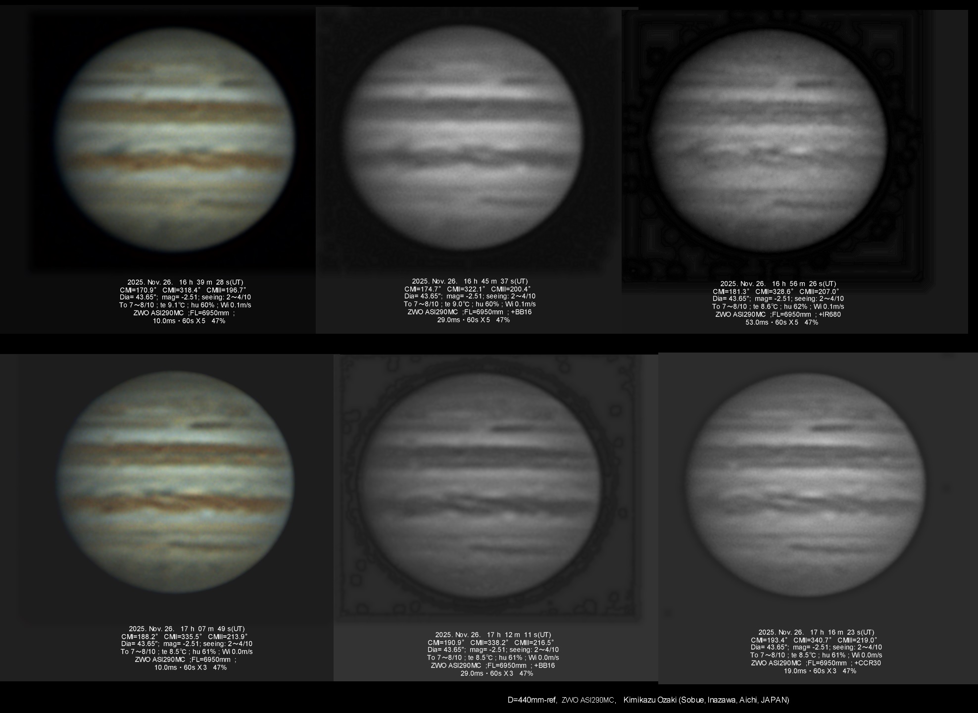 木星撮像時刻が早くなり、40°以下の高さで昨夜と同じ位相だった。BlueのNEBやIRのSEBの写りが良かった