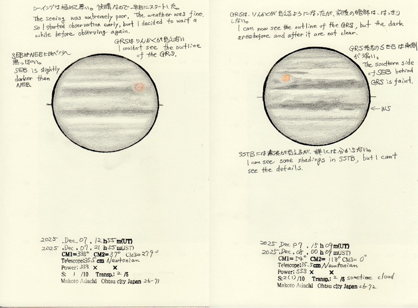 SEBは大赤斑直後で南部が淡くなっていますが、いつもシーイングが悪いため、内部の様子がわかりません。
