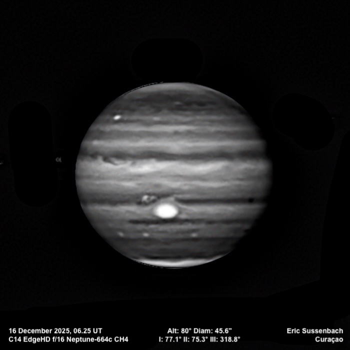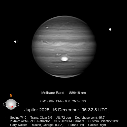 Note the large white cloud on the SSTB which is bright in methane band. The "chimney" above the GRS is WIDE OPEN!