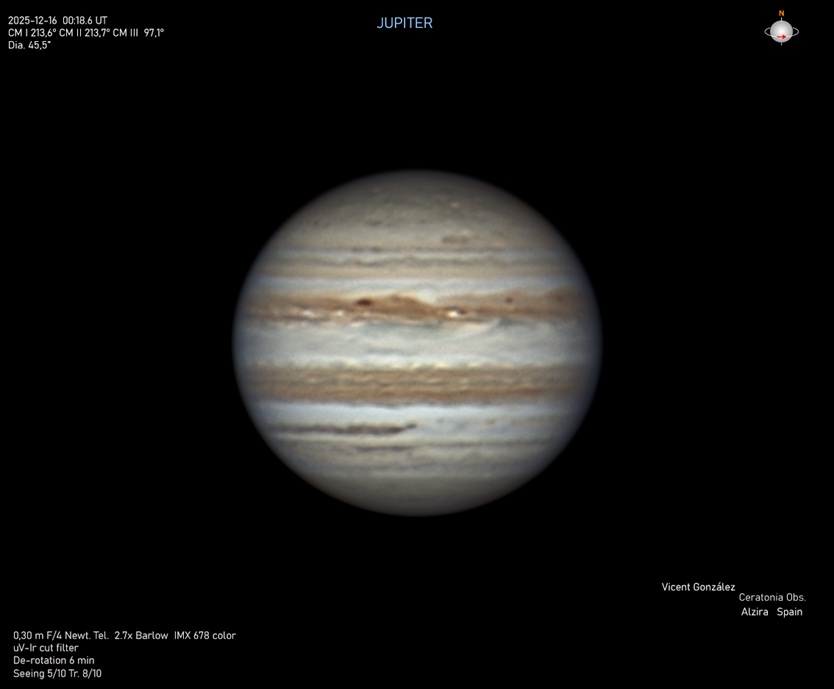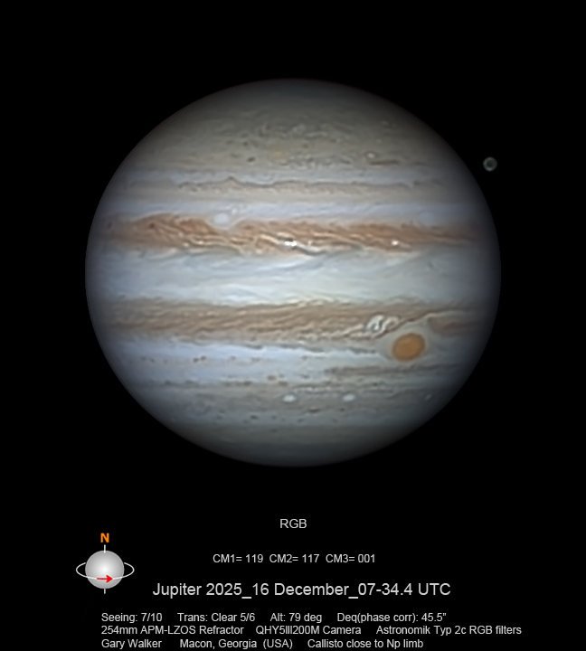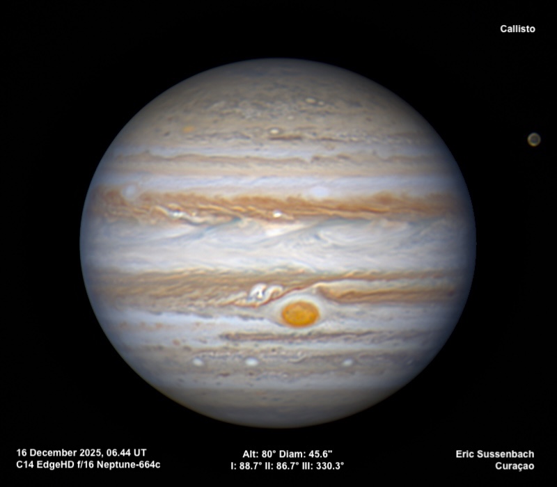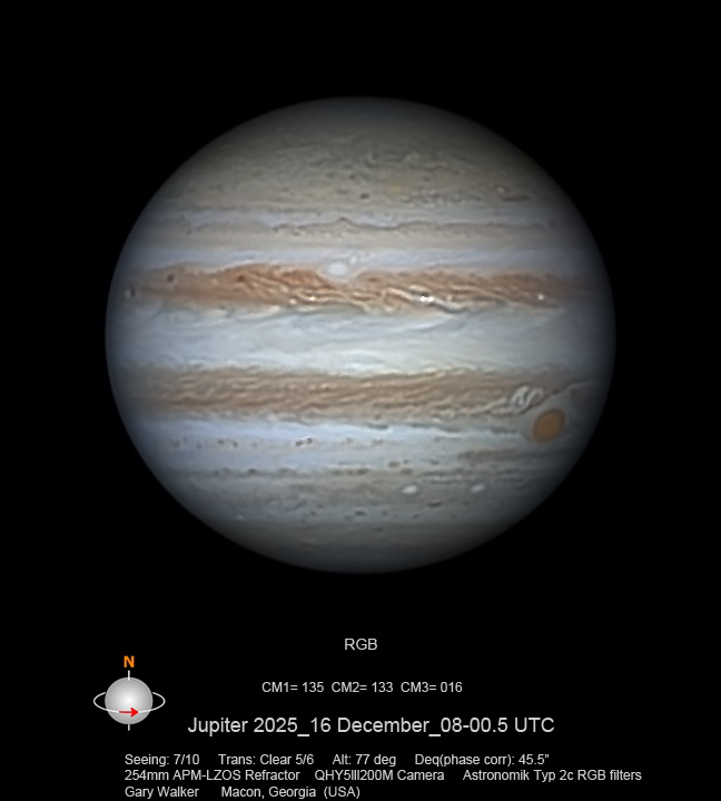 The SEB shows the dark red oval interacting with the material from the chimney. The NEB is narrow this season.