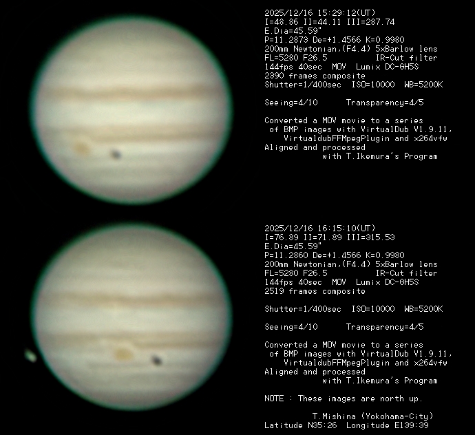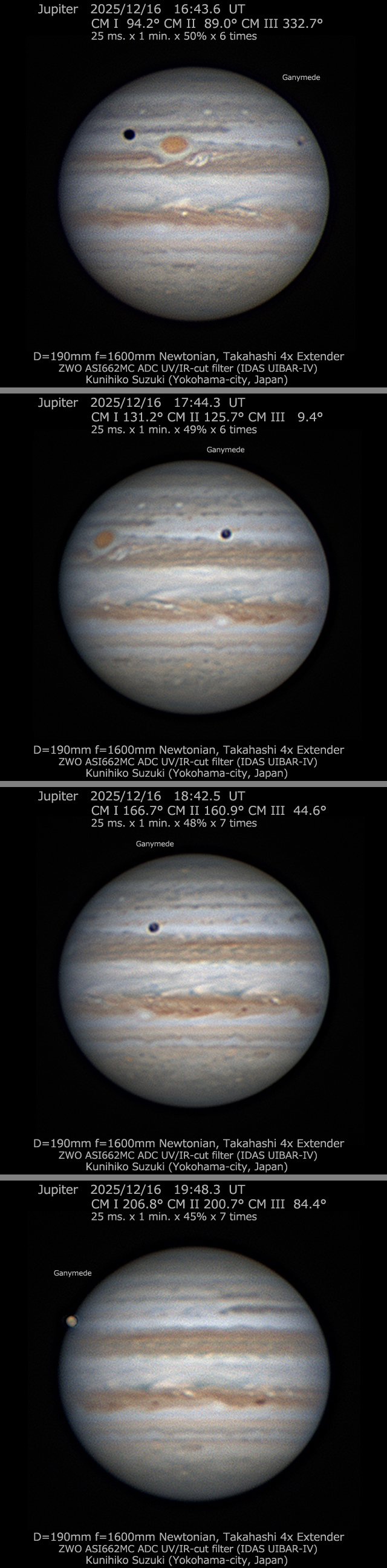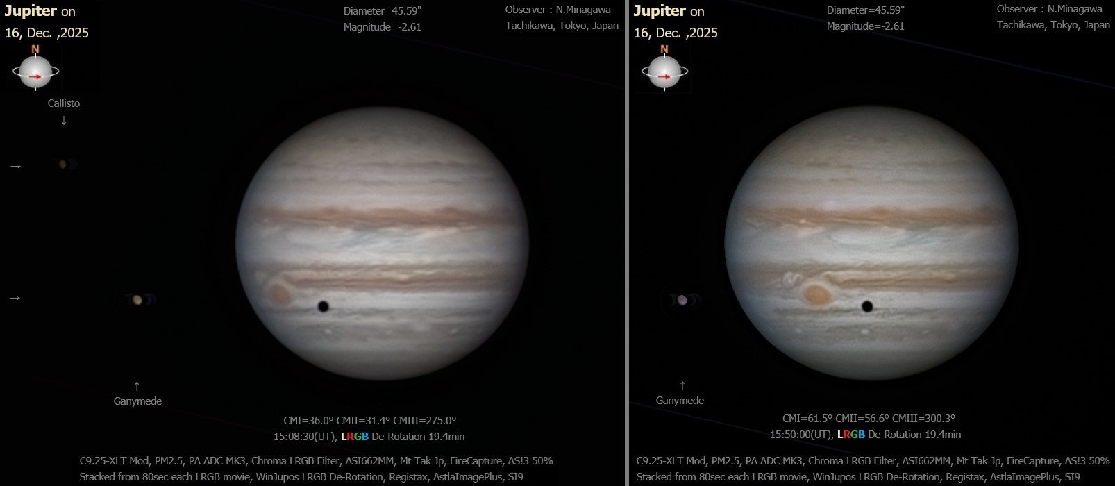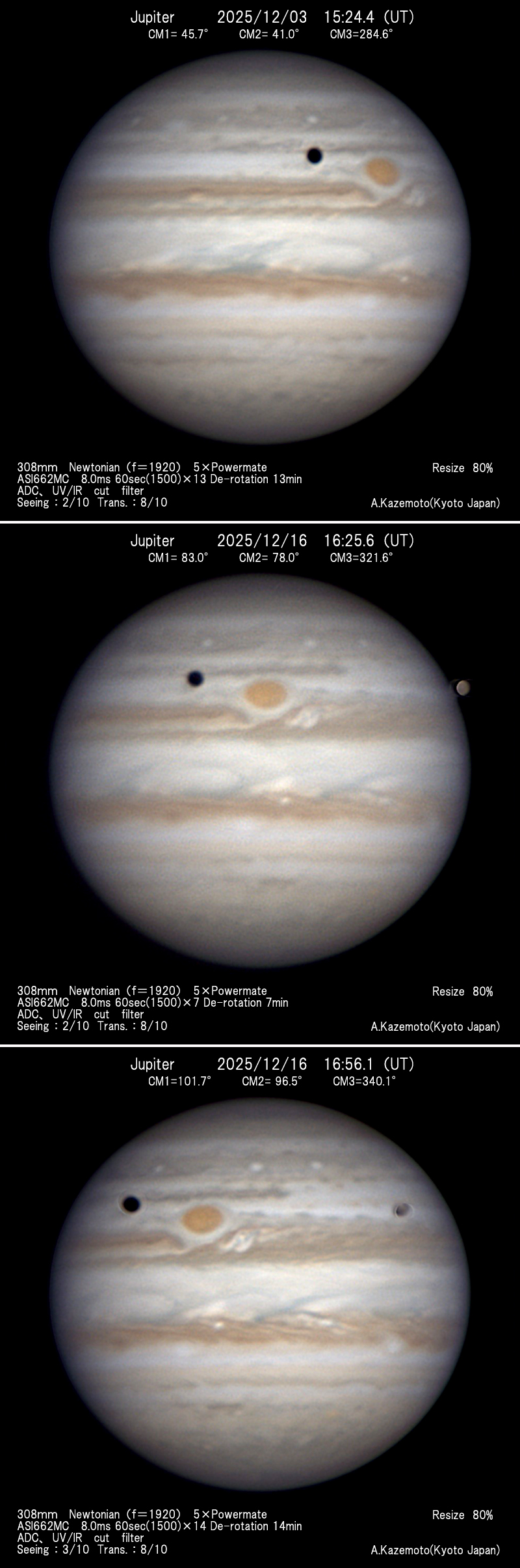 夜半過ぎからシーイングが安定してきました。ガニメデの接近とガニメデの影、遠ざかるカリストと一緒に撮影できました