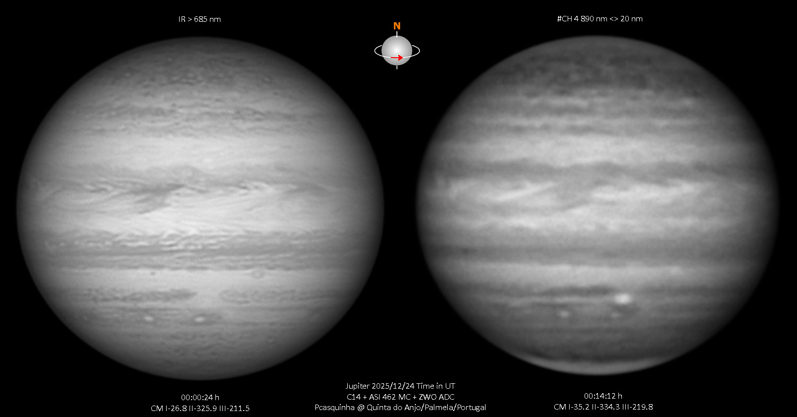 There is a bright outbreak in the NEBs at the CM of the first image. There are small red ovals on the NTBn.