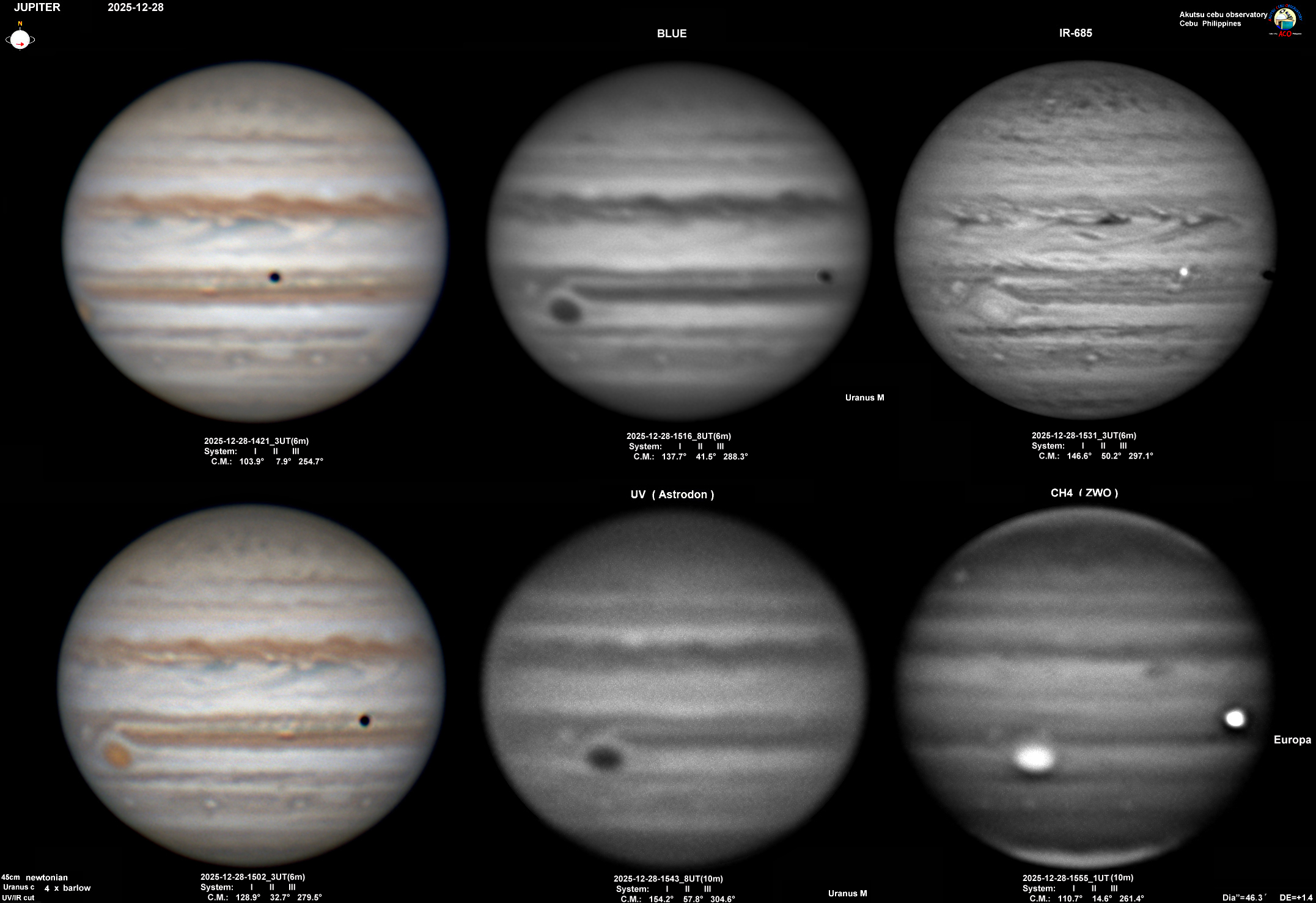 衛星Europaの影と本体が見えていますが本体の明るさは縞模様と同じ程度なのでカラーでは難しい
