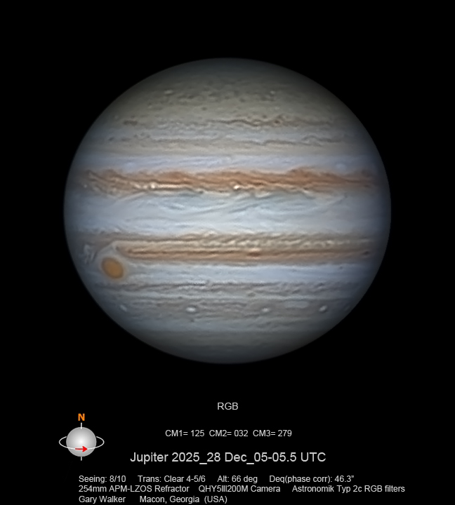 A RRGB image of Jupiter using Wavelet Compositing for better detail of Jupiter showing the evolving disturbance near the GRS
