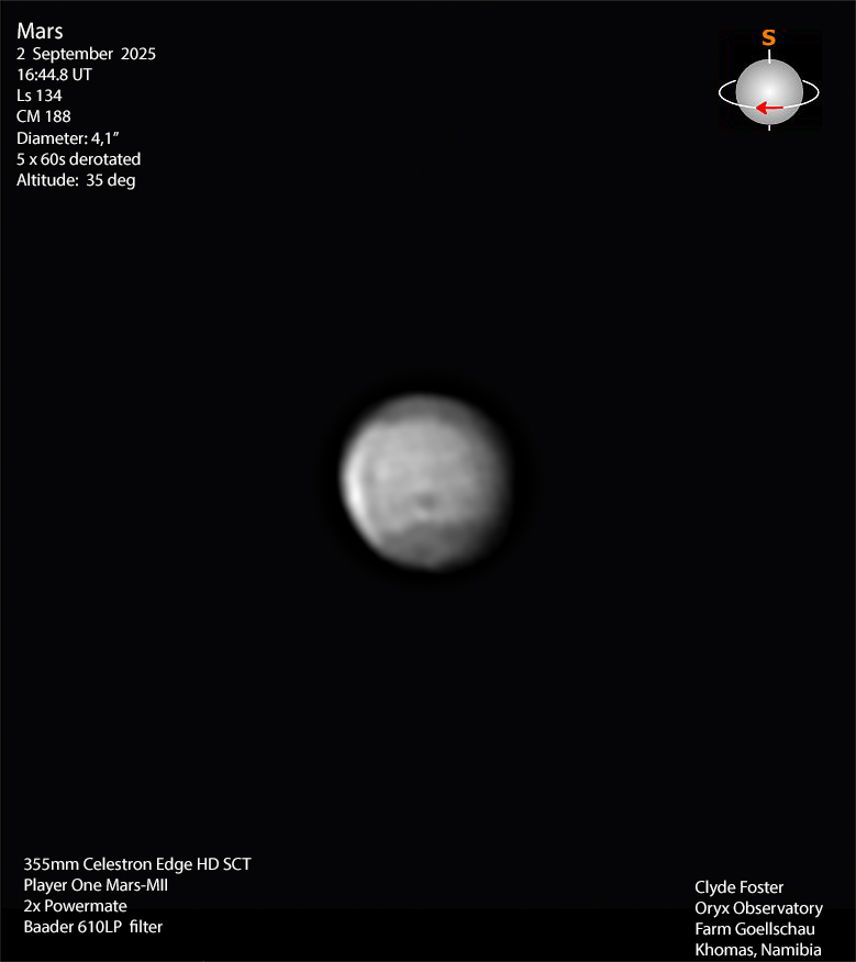Conditions were not good enough for RGB captures yesterday evening, so I just ran a series of R610LP’s. Propontis I is just below centre, with Amazonis extending left of centre.[Clyde Foster : Khomas,Namibia]