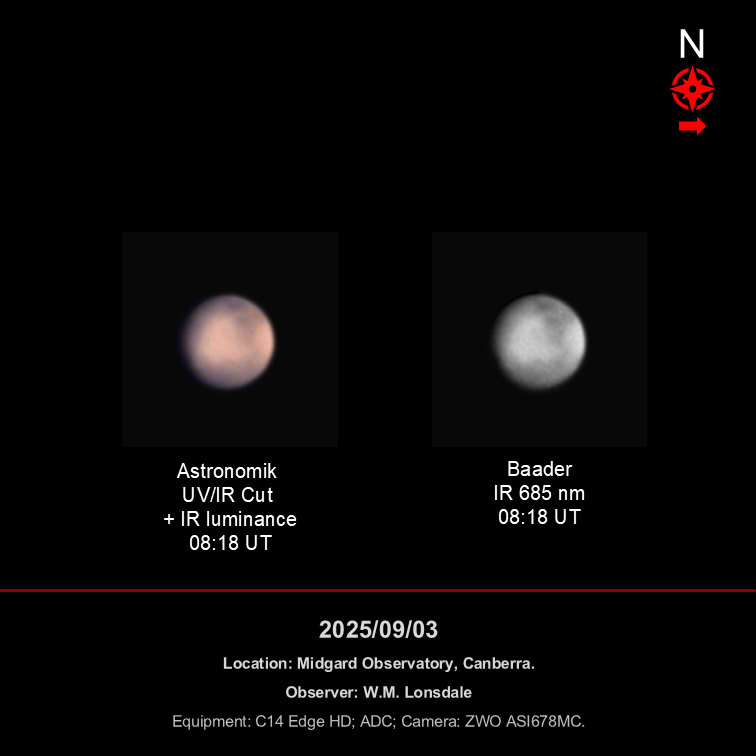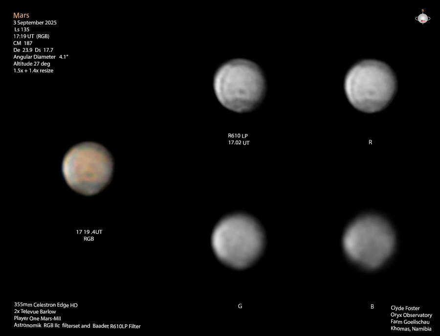 I tried running the RGB’s in B, G and R to try and catch the B under better conditions. Propontis I is just below centre, with Amazonis extending left of centre.[Clyde Foster : Khomas,Namibia]