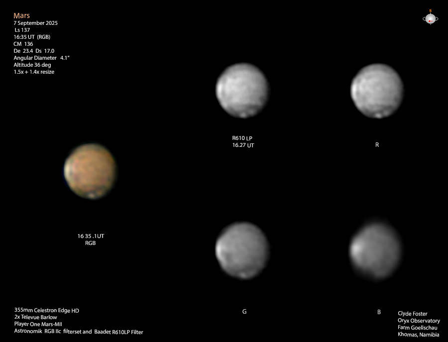 Image set from yesterday afternoon, 10mins before sunset, looking directly down on Olympus Mons (best seen in the R). Not the easiest given the current conditions, with almost no features of contrast visible in the live view.[Clyde Foster : Khomas,Namibia]