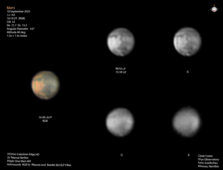 I started yesterday afternoons session about an hour before sunset to catch Mars at higher altitude and also to try and capture RGB before some forecast cloud.