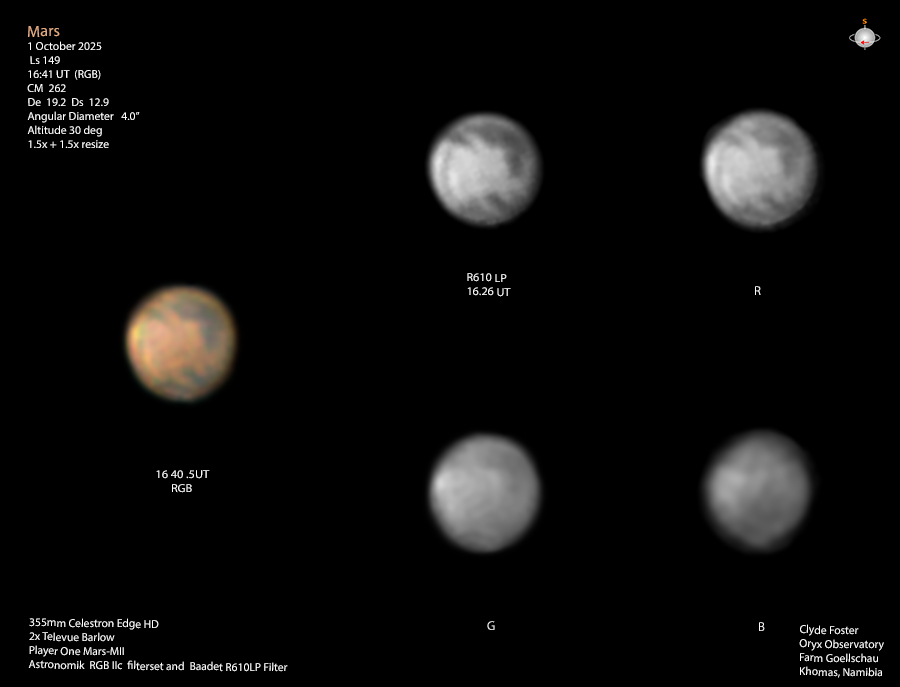 Syrtis Major is to the right with Mare Cimmerium/Tritonis Sinus on the upper left limb. Hesperia and Syrtis Minor are above centre. Boreosyrtis and Utopia are across the bottom, separated by the light Umbra.[Clyde Foster : Khomas,Namibia]